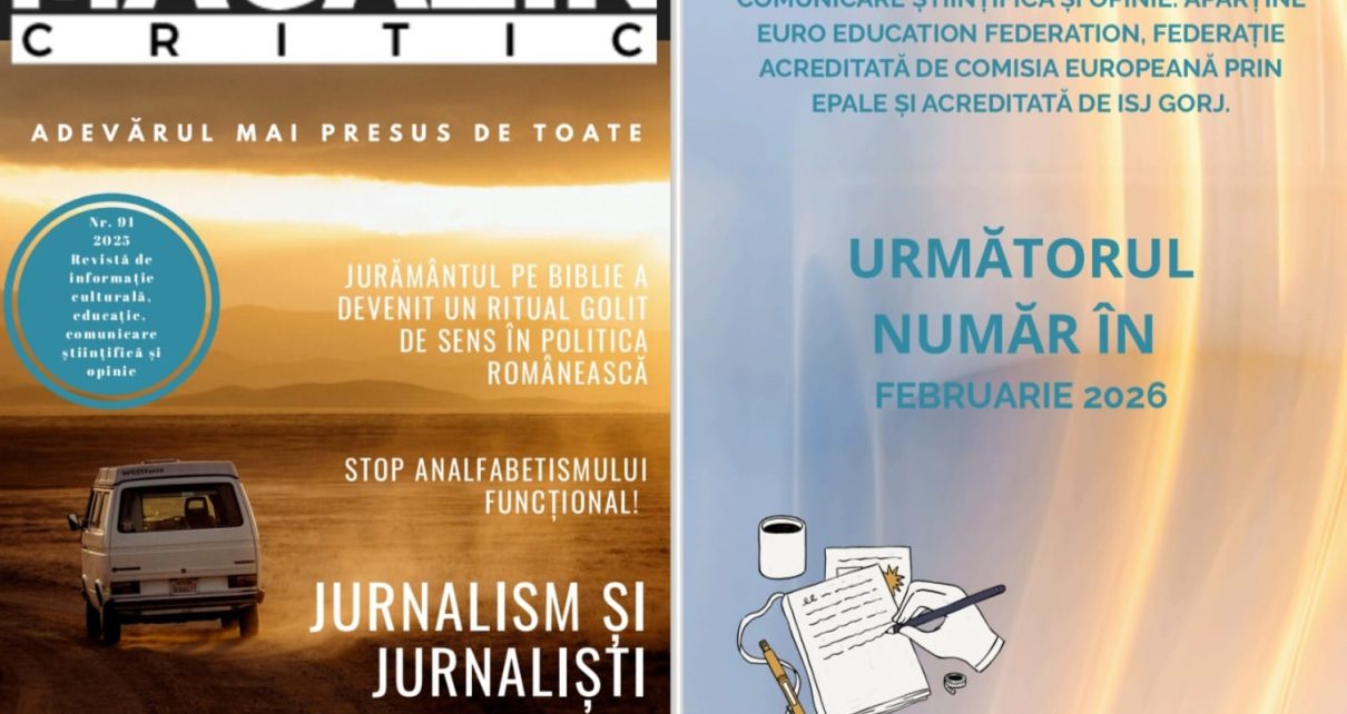 ZIARUL/PERIODICUL a fost fondat în anul 2023, este administrat de EURO EDUCATION FEDERATION și membru al Uniunii Jurnaliștilor Independenți din România. Cițiți revista integral: aici MAGAZIN CRITIC – NIHIL SINE DEO! Presă cu frică de Dumnezeu